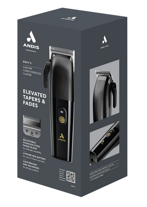 The Andis Envy II Black Clipper is a professional-grade hair clipper designed to deliver exceptional performance and precision. It's a popular choice among barbers and stylists due to its powerful motor, customizable blade, ergonomic design, and cordless convenience.