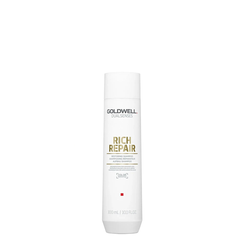 Goldwell Dualsenses Rich Repair Restoring Shampoo is a haircare product that instantly reconstructs and reawakens the shine of natural hair while minimizing color fading with every use.